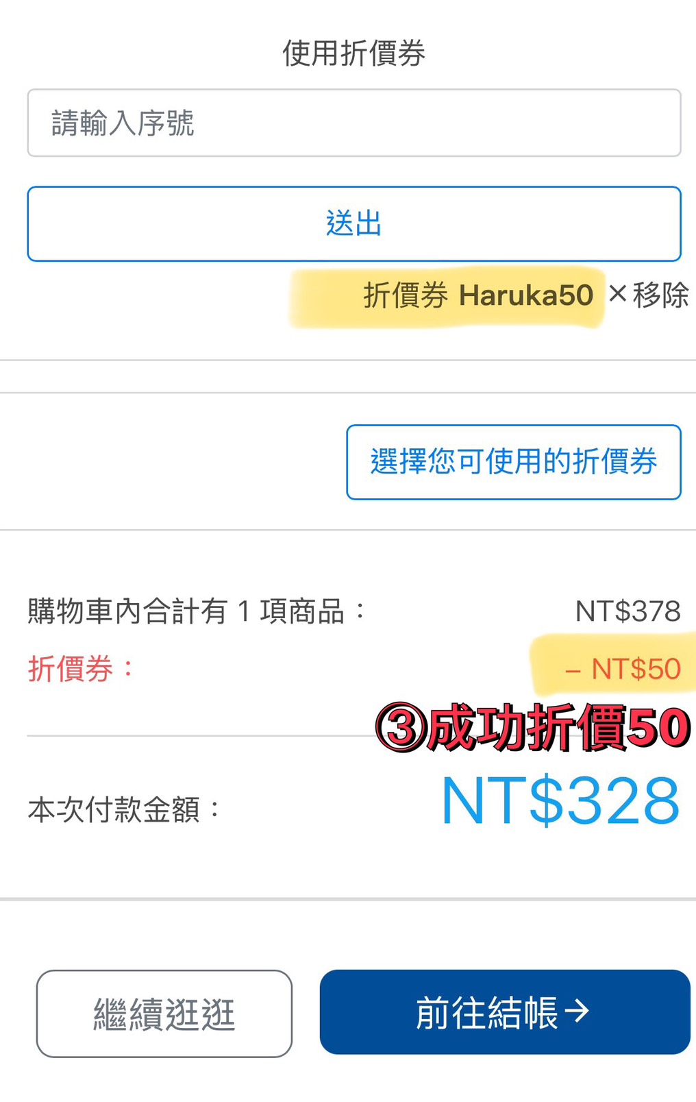 歡迎使用我的折價券序號【Haruka50】,單筆結帳滿350元即可折扣50元。